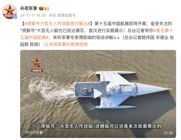 第十五届中国航展即将开幕,备受关注的“虎鲸号”大型无人艇也已抵达展区,首次进行实舰展示。(央视军事)