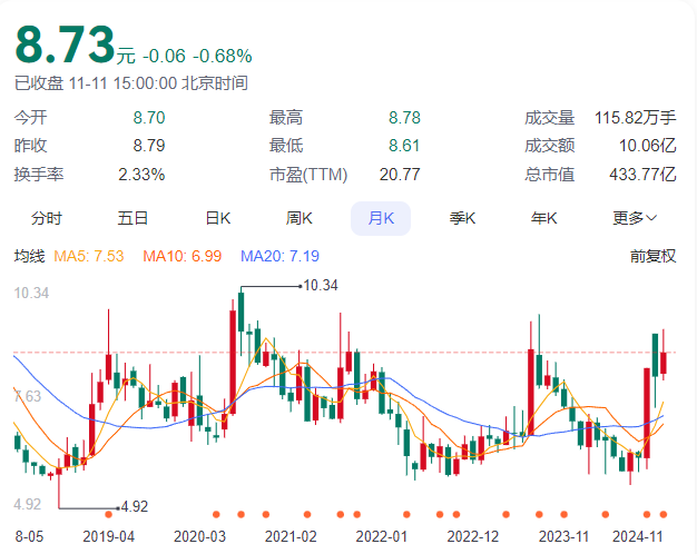 11月11日,东吴证券报收8.73元/股,当日收跌0.68%,总市值为433.77亿元。