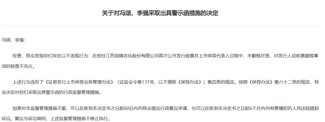 剑牌农化的两名保荐代表人也收到了警示函。理由是在担任江苏剑牌农化股份有限公司首次公开发行股票并上市保荐代表人过程中,未勤勉尽责,对发行人应收票据等事项的核查不充分。