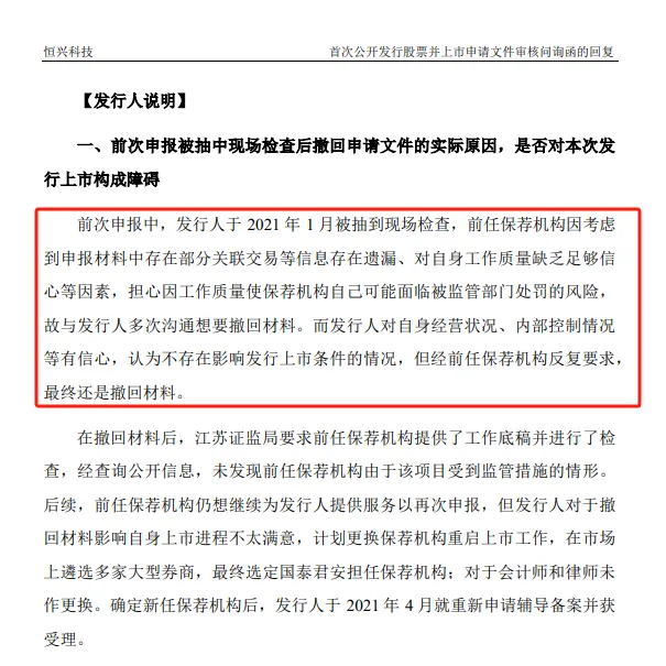 “前任保荐机构(即东吴证券)因考虑到申报材料中存在部分关联交易等信息存在遗漏、对自身工作质量缺乏足够信心等因素,担心因工作质量使保荐机构自己可能面临被监管部门处罚的风险。故与发行人多次沟通想要撤回材料。”恒兴科技表示。