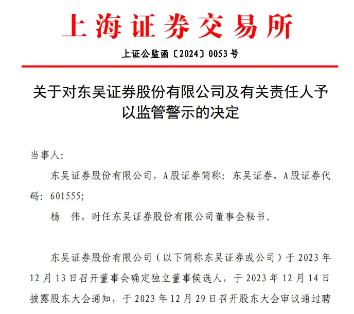 警示函中提到,东吴证券于2023年12月13日召开董事会确定独立董事候选人,次日披露股东大会通知,于同年12月29日召开股东大会审议通过聘任独立董事的议案。但是,公司未能在选举独立董事的股东大会通知公告前,即2023年12月14日前通过上交所公司业务管理系统提交独立董事候选人的有关材料,迟至同年12月28日才提交独立董事候选人的有关材料,经上交所要求补正后,至2024年1月3日即股东大会召开后才完成补充提交,备案时间明显迟延,聘任流程存在重大瑕疵。