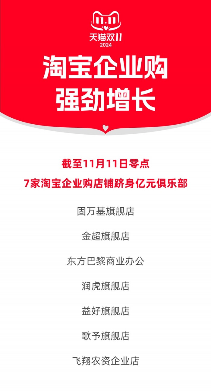 在天猫双11收官前夕,7家淘宝企业购店铺累计年成交破亿,包括紧固件类目固万基旗舰店、金超旗舰店、个性定制类目的益好旗舰店、商务设计类目歌予旗舰店、现代农业行业的飞翔农资企业店等。