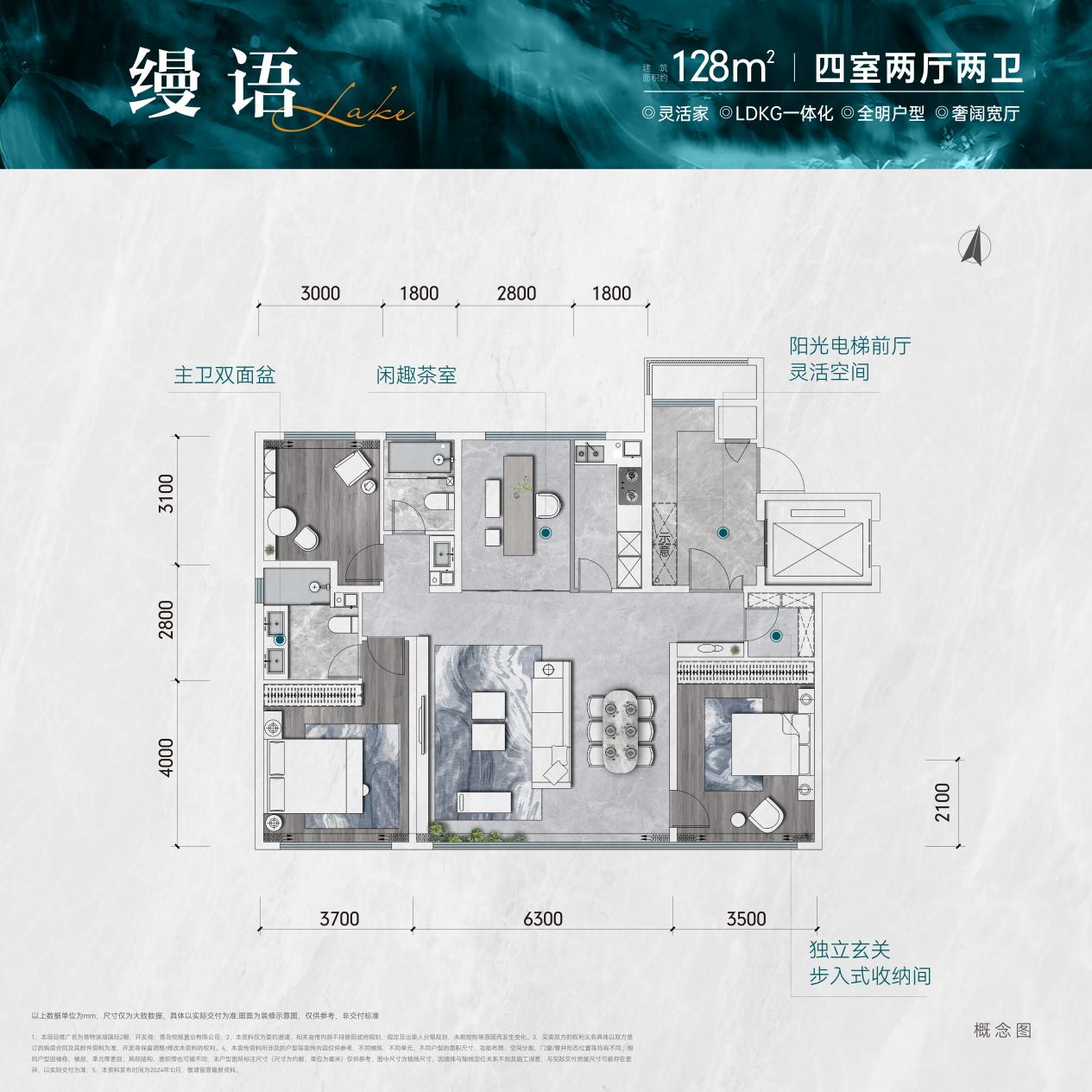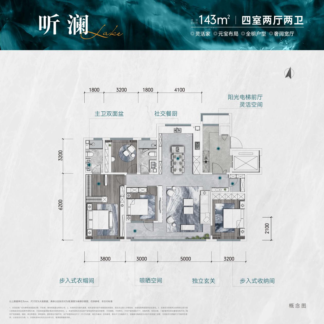 其中,为了提升户型关系场打动力,青特研发了新一代“场景化户型”,一个户型可以拆分出无限的生活场景。这款建筑面积约143㎡的户型,室内空间+灵活空间可实现约143㎡的使用空间。