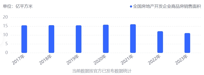 2021年,我国房地产竣工面积达10.14亿平方米、销售面积达16.14亿平方米,两项数据达到近年来高点,随后即掉头向下,房地产成交量逐渐走低。