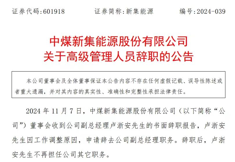 11月7日,新集能源(601918)发布公告称,2024年11月7日,公司董事会收到公司副总经理卢浙安先生的书面辞职报告,卢浙安先生因工作调整原因,申请辞去公司副总经理职务。辞职后,卢浙安先生不再担任公司其它职务。