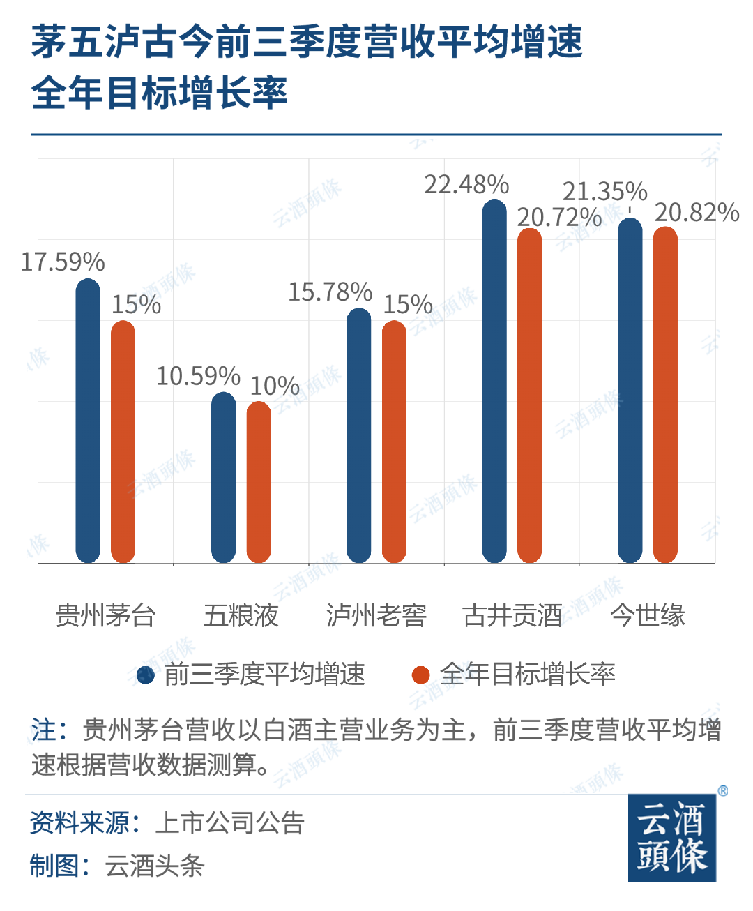 贵州茅台、五粮液、泸州老窖、古井贡酒、今世缘这5家酒企三季报数据表现尤为突出,前三季度的营收平均增长速度均超过了各自设定的全年目标增速。