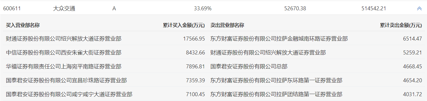 大众交通今日涨停,龙虎榜数据显示,上榜营业部席位全天成交7.35亿元,占当日总成交金额比例为14.28%。其中,买入金额为4.84亿元,卖出金额为2.51亿元,合计净买入2.32亿元。