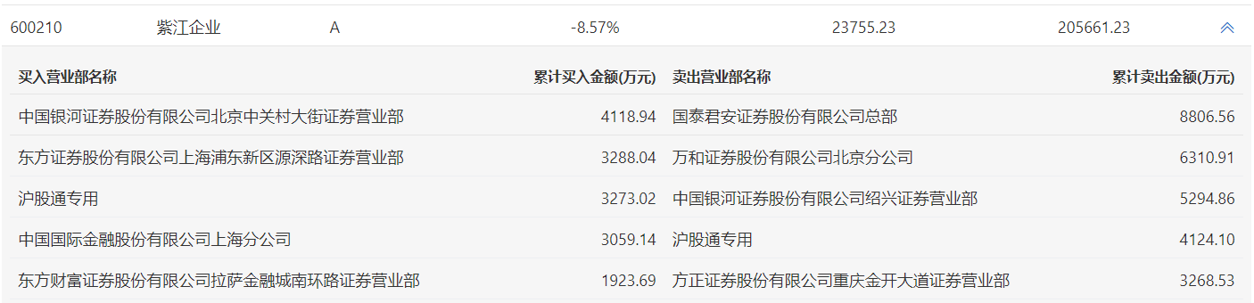 紫江企业今日跌停,龙虎榜数据显示,上榜营业部席位全天成交4.35亿元,占当日总成交金额比例为21.14%。其中,买入金额为1.57亿元,卖出金额为2.78亿元,合计净卖出1.21亿元。