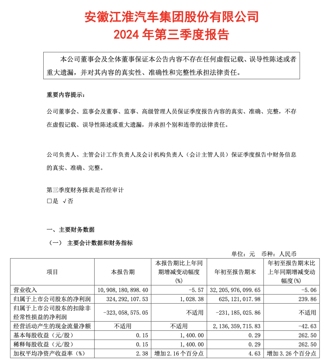 财报显示,江淮汽车2024年前三季度公司实现营业收入322.06亿元,同比下降5.06%;归母净利润为6.25亿元,同比增长239.86%,但扣非净利润为-2.312亿元,较去年同期减亏,未实现盈利。