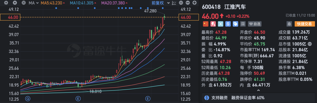 车东西11月12日消息,就在刚刚,江淮汽车的股价继续飙升,收盘报价46元,市值达1005亿元。而站上千亿市值,江淮只用了两个月。