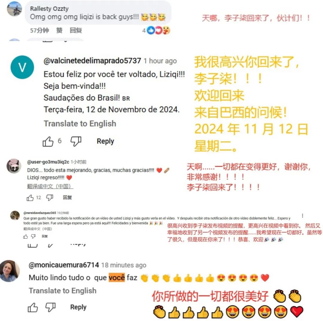 在Youtube上,也有超过1990万粉丝等待了近四年之久。大部分观众表达了惊喜,“谢天谢地,Ziqi终于回来了,有你在,世界变得更美丽”,“在世界最需要她的时候,她回来了”,“再次温暖了我们的心灵、思想和灵魂!”,“她的生活是如此疗愈,展示了世界和平美好的样子”,也有人留言中怀念起了亲人,“四年前我和爸爸一起看你的视频,现在他已经不在了,但是很高兴,你又回来了!”