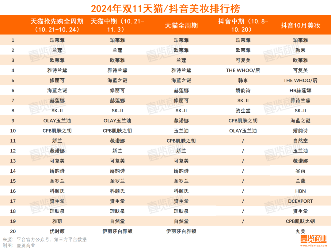 今年双11全周期,天猫大美妆发布了多份行业榜单,抖音也首次发布官方半程榜单。总体来看,前10格局稳定,日系品牌重新上榜。