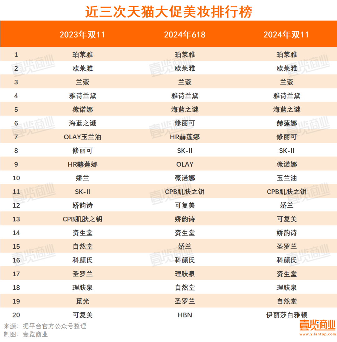 壹览商业统计近三次大促数据发现,国货美妆分层已定,但大促的榜单表现还不够稳定。