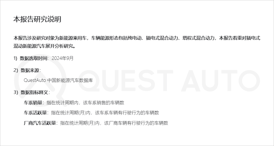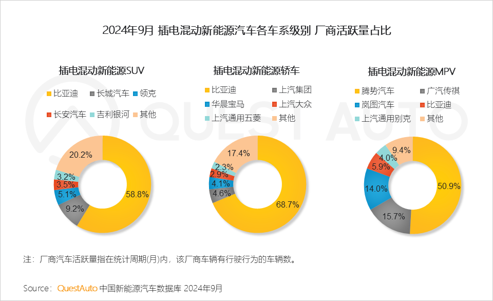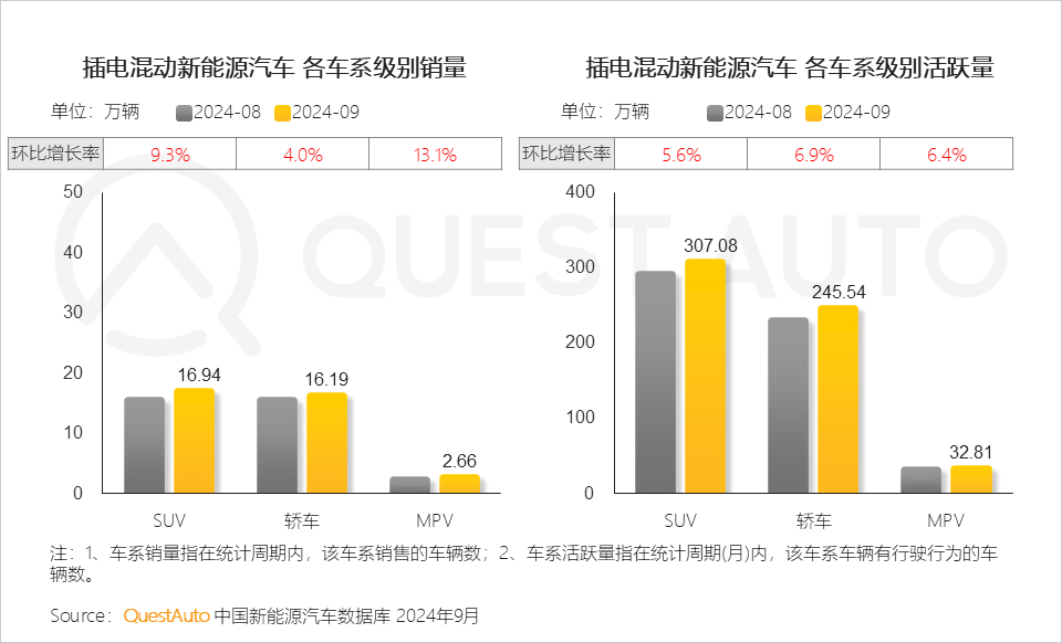 2、从车系级别来看,插电混动新能源汽车多为SUV车系,QuestAuto数据显示,2024年9月,插电混动SUV活跃量已突破300万辆
