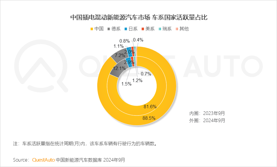 QuestAuto数据显示,2024年9月,国内插电混动新能源汽车市场中,国产车系活跃量占比已达88.5%,较去年同期提升6.9个百分点,德系、日系、美系及其他国家车系份额被进一步挤压。