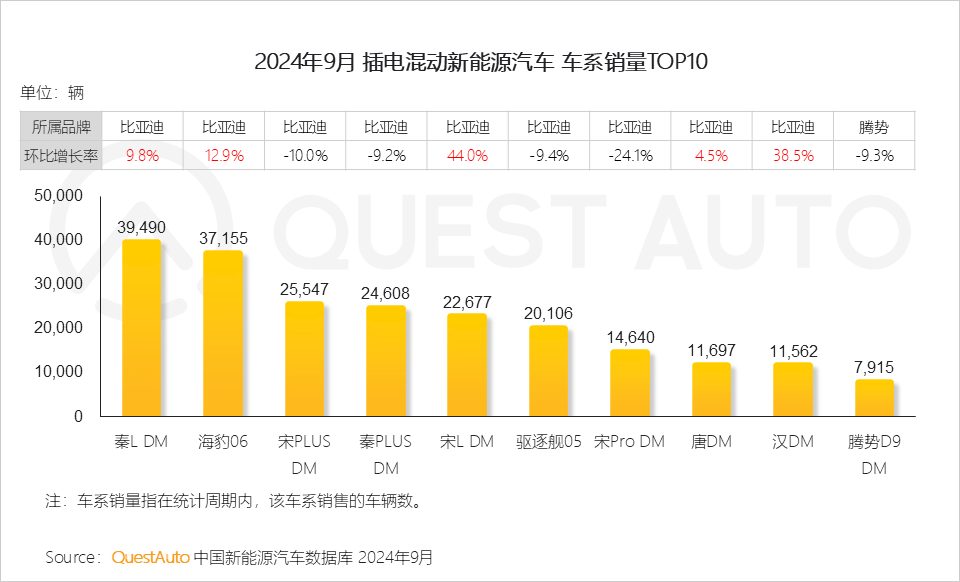 4、2024年9月插电混动新能源汽车销量榜TOP10中,比亚迪旗下车系占据9席,其中,秦L DM、海豹06、宋PLUS DM等五款车系销量均突破2万辆