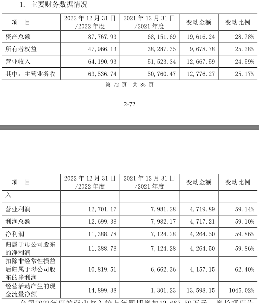 由于是过往资料,能看到公司2022年营业收入6.42亿元规模,同比增长24.59%,净利润1.14亿元,同比增幅为59.86%。