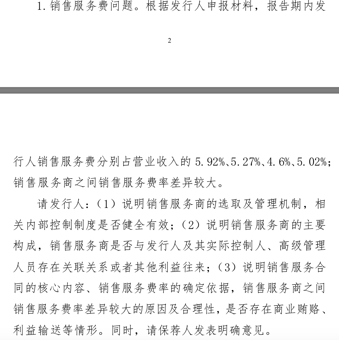 就此,上市委要求公司说明销售服务商的选取及管理机制,相关内部控制制度是否健全有效;销售服务商的主要构成,销售服务商是否与发行人及其实际控制人、高级管理人员存在关联关系或者其他利益往来;销售服务合同的核心内容、销售服务费率的确定依据,销售服务商之间销售服务费率差异较大的原因及合理性,是否存在商业贿赂、利益输送等情形。