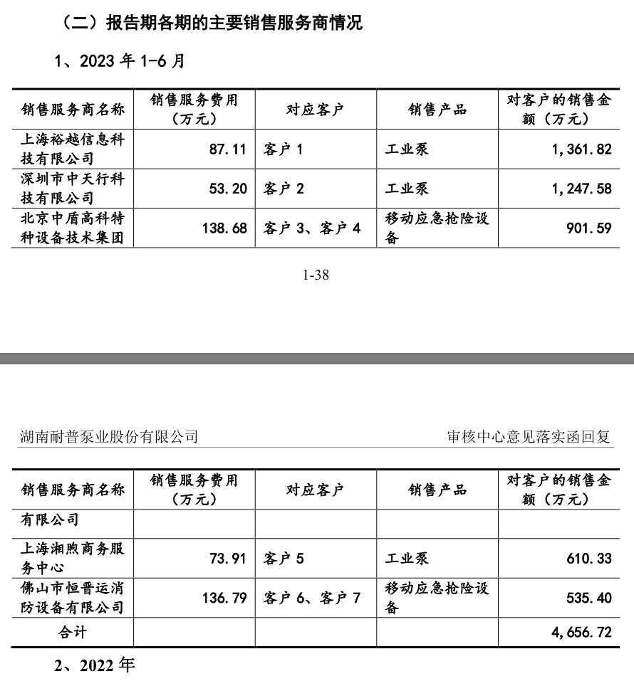 耐普股份介绍,2020年至2023年上半年工业泵产品通过销售服务商协助实现的收入分别为4505.80万元、8106.08万元、7944.99万元和4124.77万元; 报告期各期,移动应急供排水装备产品通过销售服务商协助实现的收入分别为10335.48万元、10512.92万元、13817.62万元和3428.73万元。发行人通过销售服务商协助实现的收入占全部实现收入的比例分别为35.33%、36.14%、33.90%和32.81%。