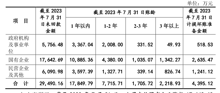 耐普股份介绍,2020年至2023年前7个月应收账款余额(含未到期质保金)分别为15731.81万元、23109.28万元、28004.73万元和29490.16万元,截至2023年7月31日,公司应收国有企业账款17642.69万元,占未回款金额的比例为59.83%;应收政府机构及事业单位账款5756.48万元,占比为19.52%;应收民营企业及其他账款6090.98万元,占比为20.65%。