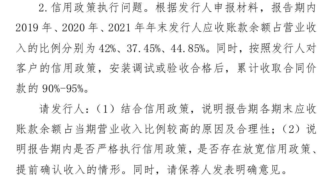 其次,上市委指出了应收账款的情况。根据发行人申报材料,报告期内2019年、2020年、2021年年末发行人应收账款余额占营业收入的比例分别为42%、37.45%、44.85%。同时,按照发行人对客户的信用政策,安装调试或验收合格后,累计收取合同价款的90%-95%。