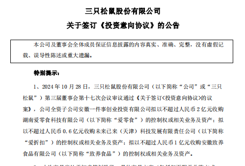其中,三只松鼠收购“爱零食”“爱折扣”和致养食品的《投资意向协议》引起广泛关注。