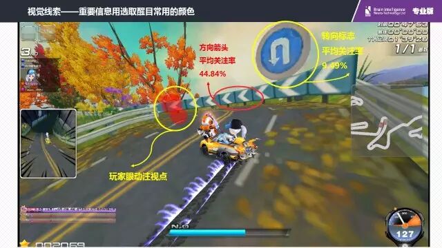 在一款赛车游戏中,路标指向左转弯,但运用了蓝色的指示牌,玩家难以注视到转向标志,导致难以即使做出策略调整,而出现失误,游戏体验骤降。