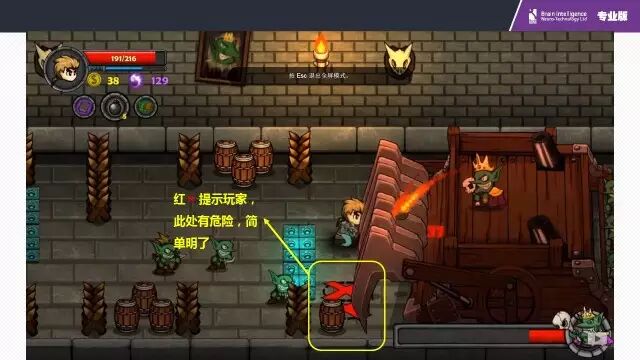 在「失落城堡」中重要的地点都有视觉线索提示。比如当炮火或重物落下时,会提前有红×预警,与玩家在生活中禁止的标志类似,让玩家容易联想到危险,提前躲避。