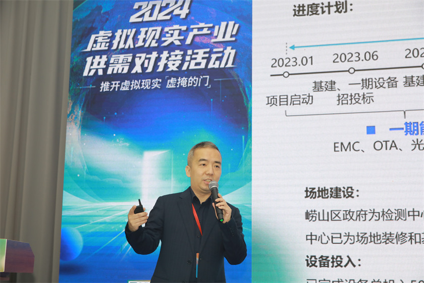 在主题演讲环节,国家虚拟现实创新中心(青岛)主任严小天首先发表演讲,分享了国创中心在XR检测与中试能力体系建设中的实践与成果。严小天指出,XR行业面临检测能力不足、标准缺失、中试环节薄弱等挑战。为解决这些问题,中心正逐步打造涵盖声学、天线、电磁兼容、光学、追踪定位等多个领域的标准化检测平台,对XR技术与产品的性能、交互性和安全性进行全面评估。