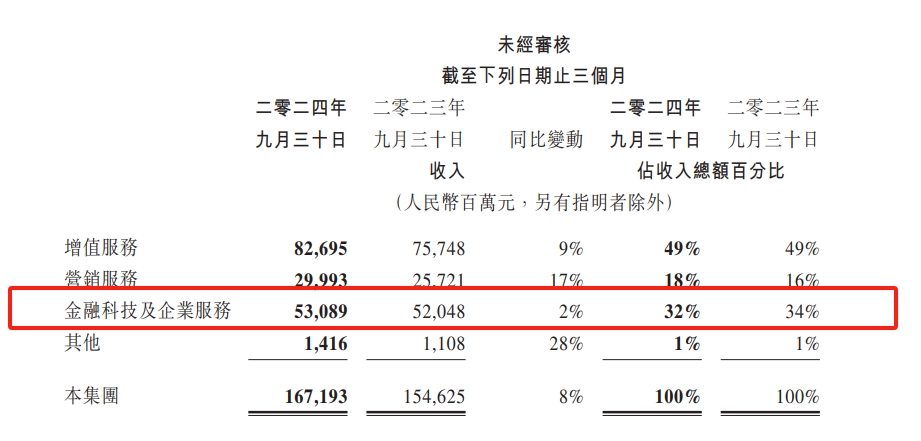 从整体上来看,腾讯的三大业务中,金融科技及企业服务业务第三季度的营收占比从34%降至32%。相比之下,营销服务从16%增长至于18%。