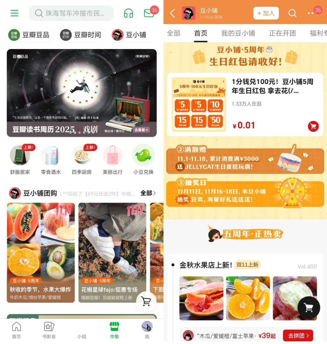 双十一当晚,我闲着无事打开豆瓣,刷着帖,发现底部出现了用红色标识出来的“11.11”字样。好奇心驱使之下,我点进去了,整个页面最显眼的是“豆小铺团购”入口,里面有棉鞋、袜子、棉拖、水果等不同主题的专场或合集,每个专场还标注着“豆小铺·5周年”——潜台词显然是会有优惠活动。