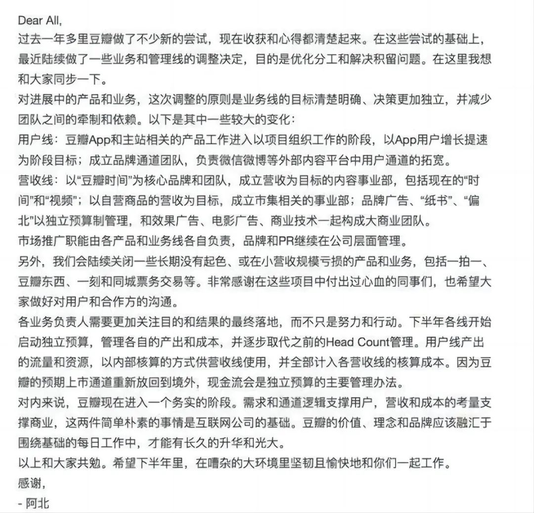 狂奔两年后,阿北在2017年8月发布内部信,表示,豆瓣现在进入务实阶段,会陆续关闭长期没有起色、营收亏损的业务,业务负责人需要更加关注目的和结果的最终落地,因为豆瓣的预期上市通道重新回到境外。
