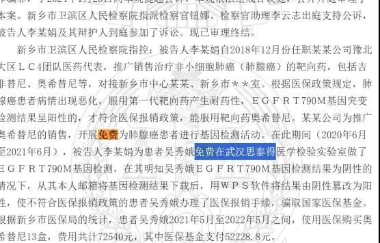 在部分判决书中,武汉思泰得被指存在大量检测报告与医保中心报备结果不一致的情况。虽然该实验室未被指直接篡改或伪造基因检测报告,但却被阿斯利康药代视为官方合作机构,患者可以在该实验室免费进行基因检测。