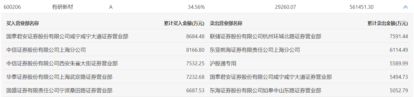 有研新材今日涨停,龙虎榜数据显示,上榜营业部席位全天成交6.81亿元,占当日总成交金额比例为12.14%。其中,买入金额为3.83亿元,卖出金额为2.98亿元,合计净买入8460.31万元。