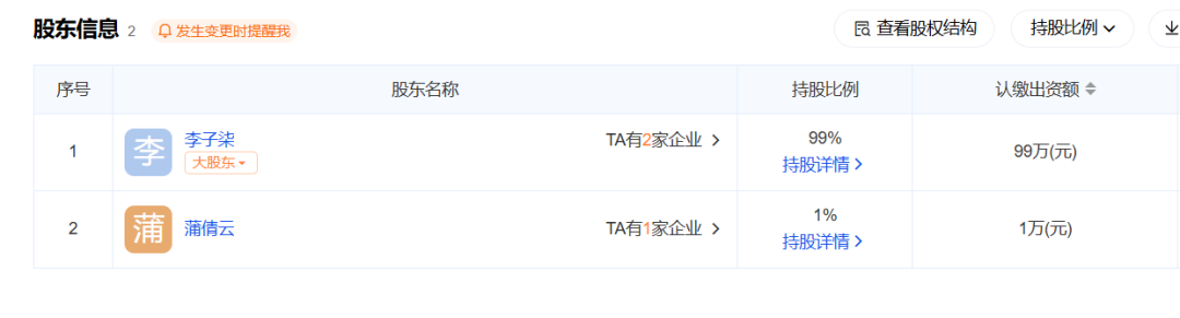 后来,刘同明退出四川子柒文化传播有限公司,蒲倩云新增,李佳佳出资99万人民币,最终拥有了该公司99%的表决权和受益股份。
