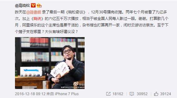 这次的收官原因,据高晓松发布的微博来看,一是有其他的工作要做,二是想着要歇一歇。微博末了高晓松还求大伙支招,下一个摊子该摆在哪里?