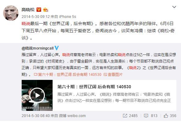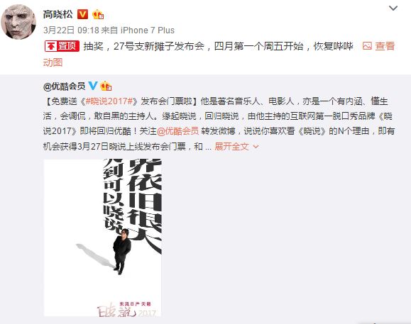 3月21日,优酷会员发布微博称《晓说2017》即将回归优酷,次日,高晓松本人转发微博证实该则消息。这意味着,从2014年5月停播的《晓说》又要回来了。还是熟悉的节目,还是熟悉的平台,还是熟悉的那张“大脸”,甚至连标语都没变,还是那句“世界依旧很大,大到可以晓说”。
