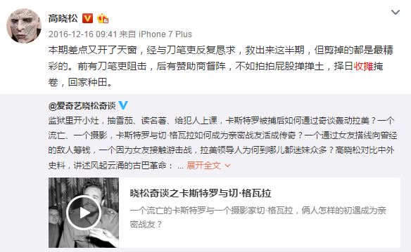 2016年高晓松又一次发微博,疑似抗议因赞助商阻挠而删减节目,这些频频发生的“意外”,也让高晓松也动了“收摊”的念头。2017年1月,《晓松奇谈》正式收官。