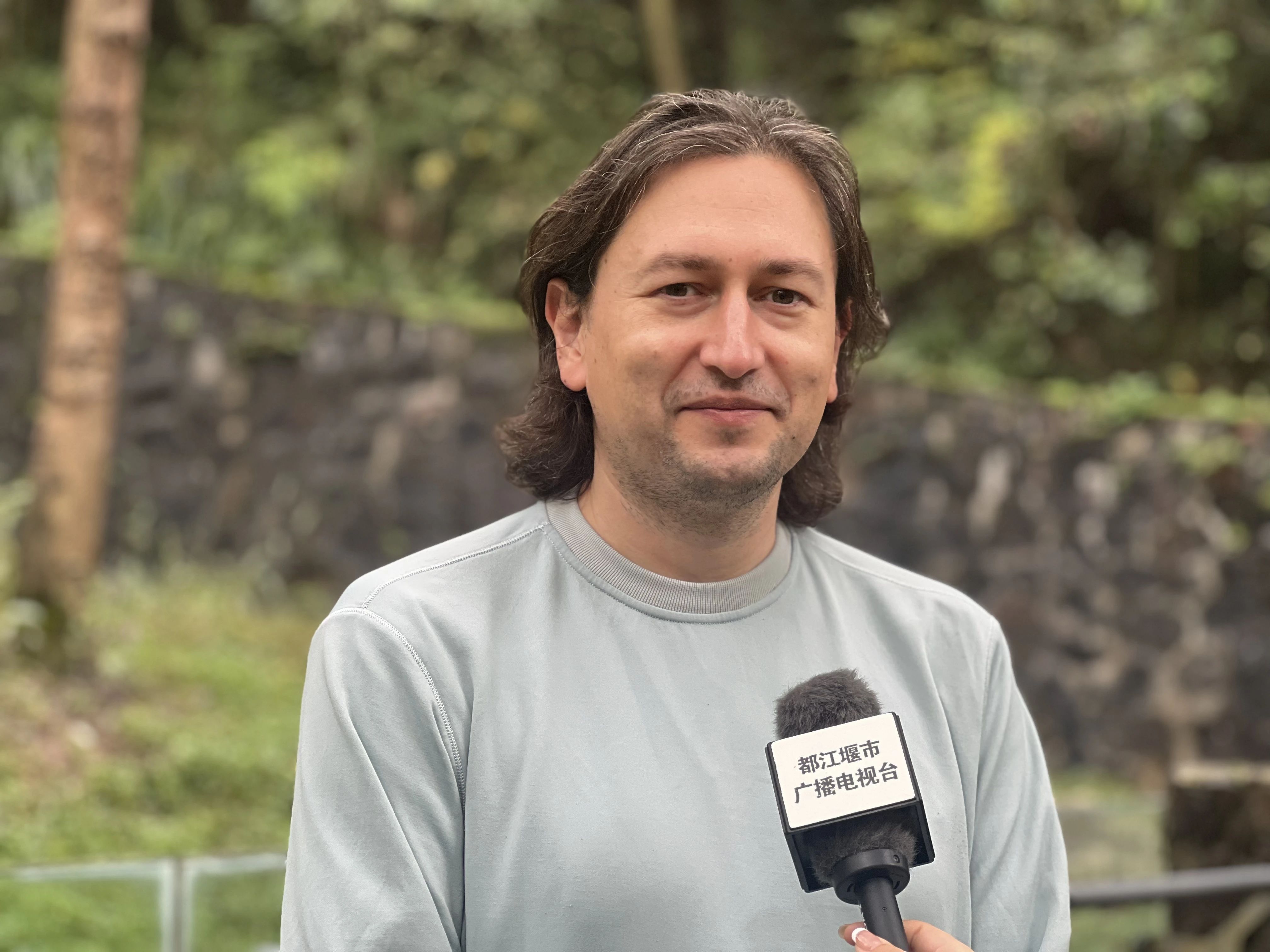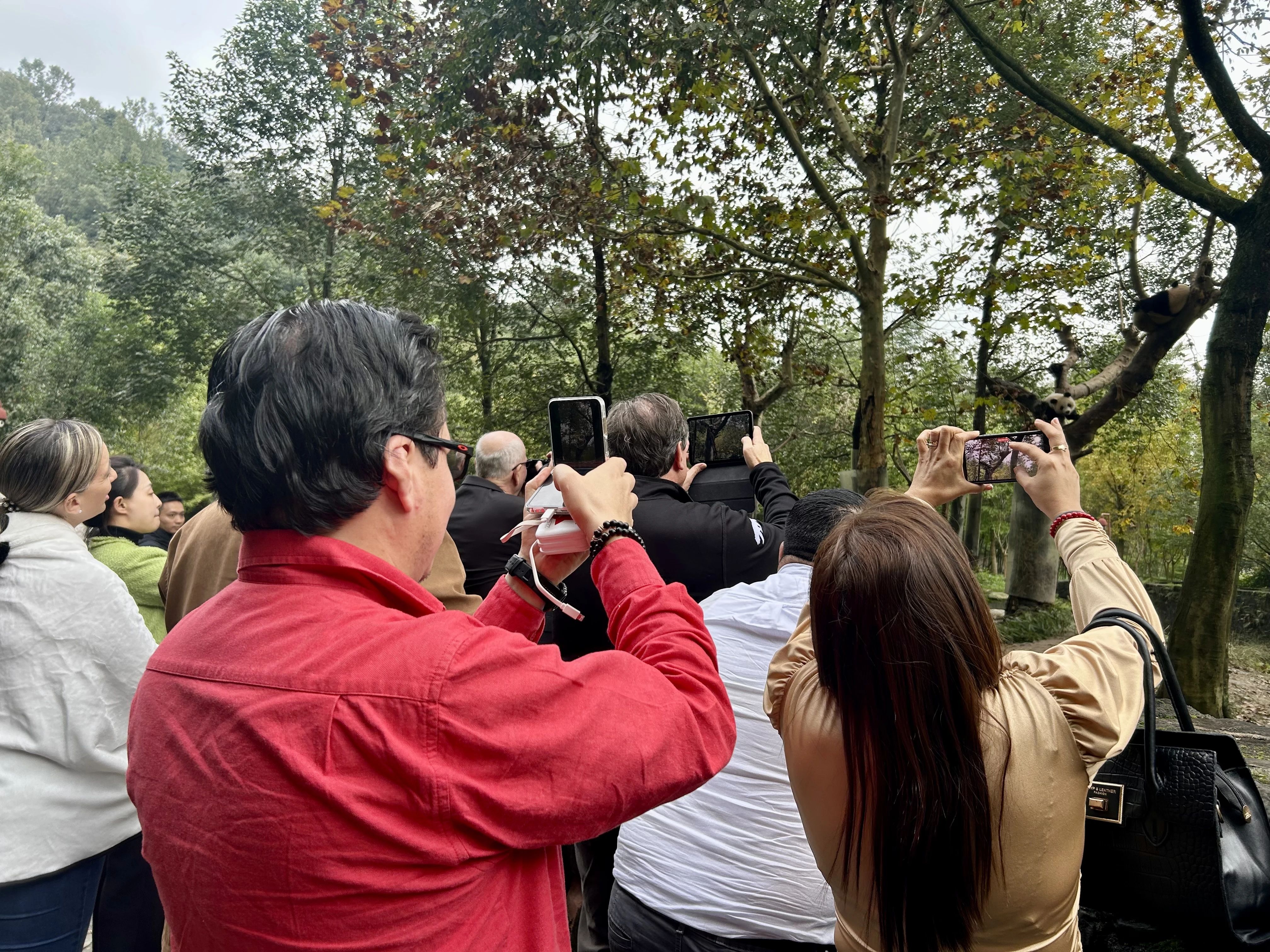 “生活在都江堰的人们太幸福了,拥有那么多可爱的大熊猫。”走进中国大熊猫保护研究中心都江堰基地,代表团成员感叹道。基地内满眼皆是郁郁葱葱的绿树,可爱的大熊猫们有的慵懒地躺在草地上,圆滚滚的模样憨态可掬;有的抱着竹子大快朵颐,津津有味的吃相萌化人心。代表团一边认真了解大熊猫的生活习性、繁育保护情况以及中国为保护这一珍稀物种所作出的努力;一边拿起手机、相机拍照留念,用镜头记录下大熊猫的可爱模样。来自德国北威州的米罗斯·米洛舍维奇在得知都江堰是人均拥有熊猫最多的城市之一时,他感到惊讶和赞叹,他说:“大熊猫非常可爱,它们慵懒地躺着、吃竹子,能看出来它们在都江堰生活得很悠闲,我想这也是得益于这里良好的生态环境,我认为都江堰是一个美丽的城市。我期待回去后和家人朋友分享我在这里的美好时光,有机会我一定会再来中国。”