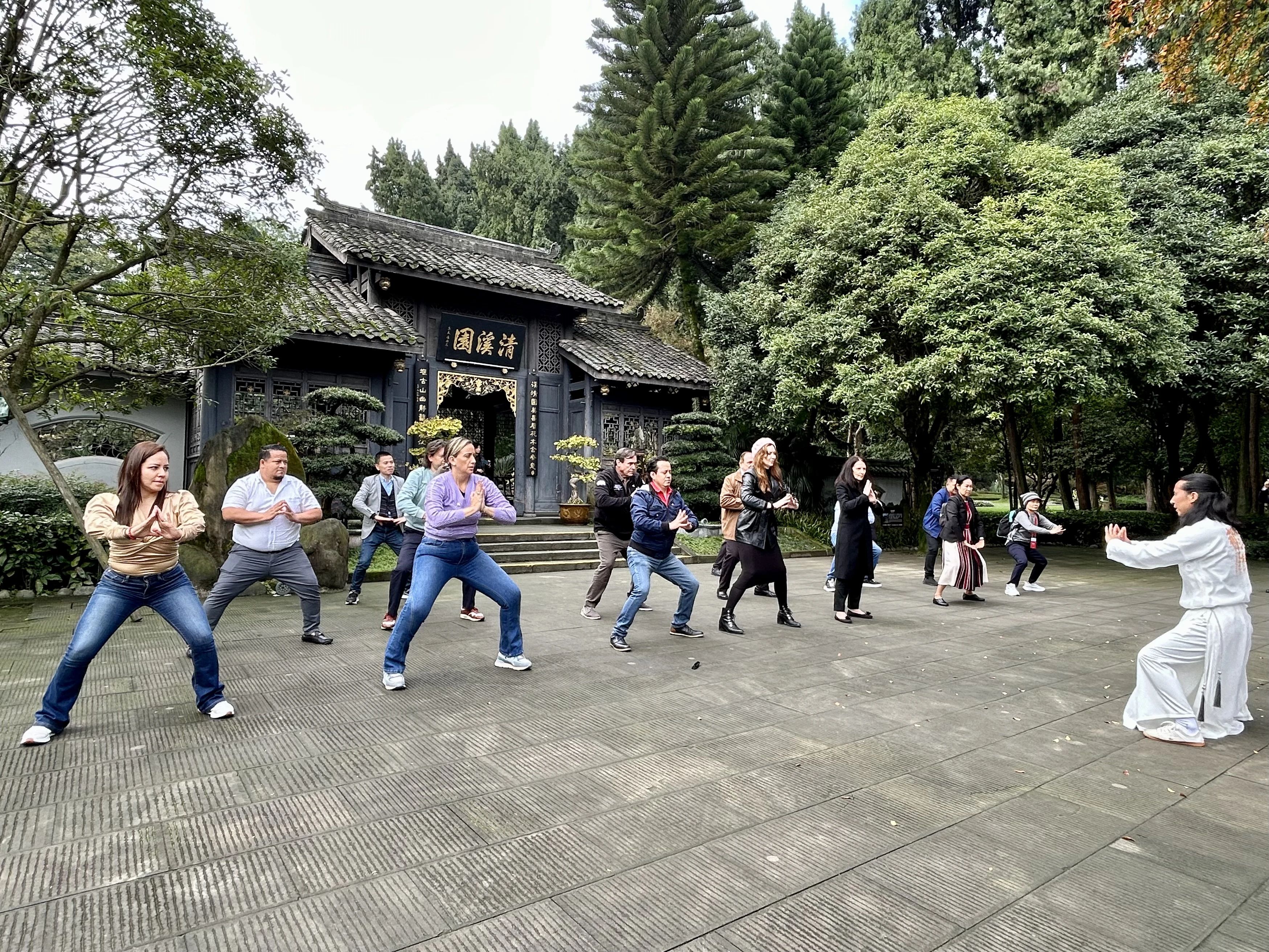 参访中,代表团观赏并体验青城太极,在行云流水的一招一式中感受道家文化、武术养生的魅力,对都江堰特色文化有了更全面、更深入的了解。