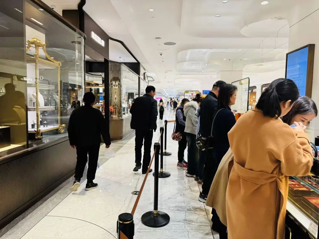 事实上,SKP的黄金饰品商铺大多集中在B1层,老铺黄金在一层设置铺面颇有些“引流”的考量。从结果来看,策略是奏效的。到了中午11点20分,老铺黄金B1层的铺面已经有二十多人在排队,成为了整座商城人气最高的店铺。