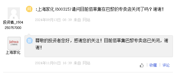 上海家化宣布佰草集巴黎专卖店关闭 图片源自上海证券市场沟通平台上交e互动