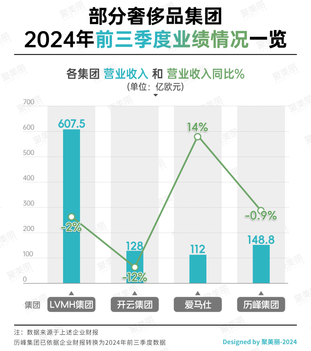 除爱马仕外,LVMH、开云、历峰集团的整体营收均下滑;