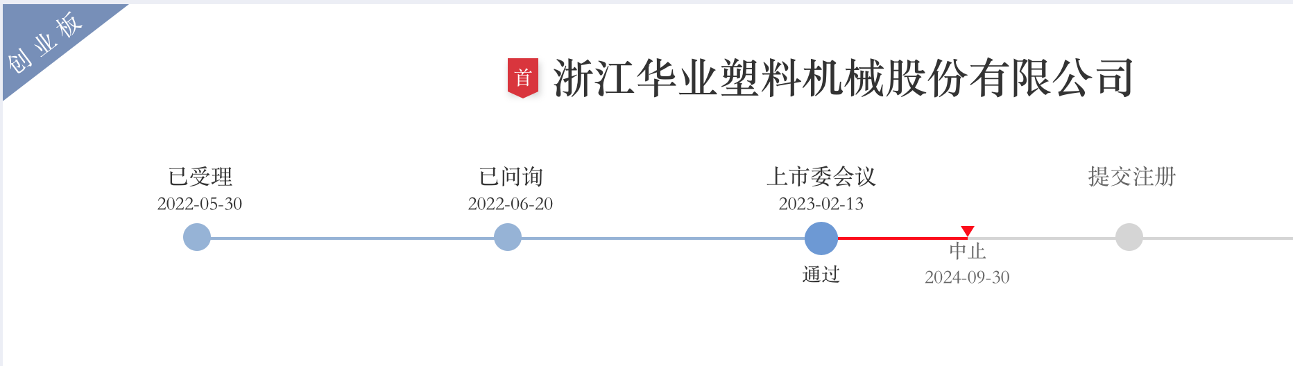 追求创业板上市的浙江华业塑料机械股份有限公司(简称:浙江华业),如今已卡在提交注册环节21个月了,目前处于“中止”更新财务资料中。