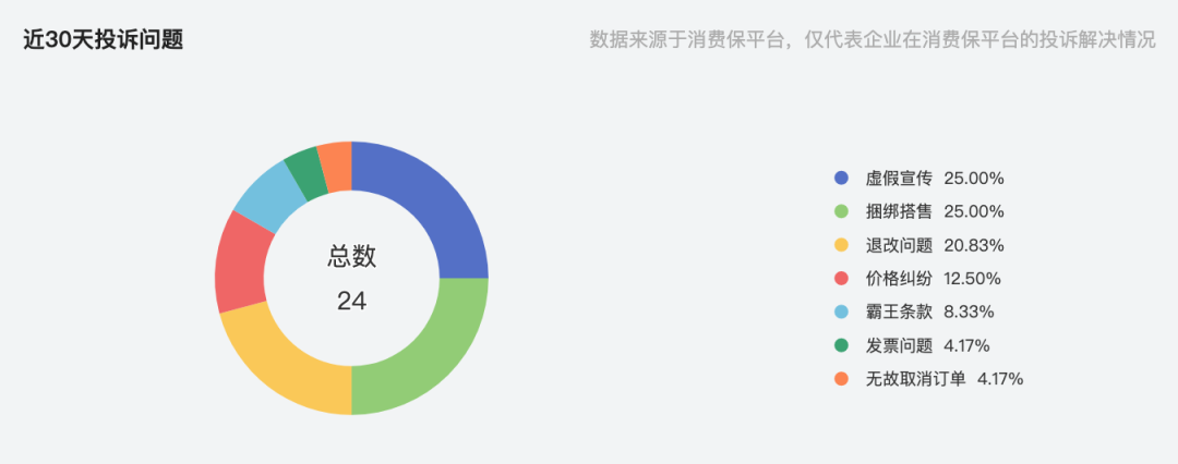 另外,「子弹财经」在消费保平台发现,航班管家近30天内获得了24次投诉,其中虚假宣传、捆绑销售的投诉占比分别为25%;退改问题的投诉占比为20.83%;其余为价格纠纷、霸王条款、发票问题以及无故取消订单等投诉问题。