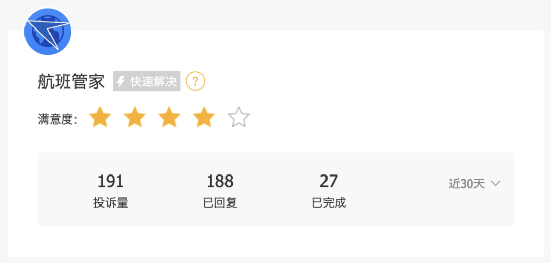 截至11月13日的近30天内,高铁管家的投诉完成数量为12条,占期内投诉总量的约32%;航班管家的投诉完成数量为27条,占期内投诉总量的约14%。