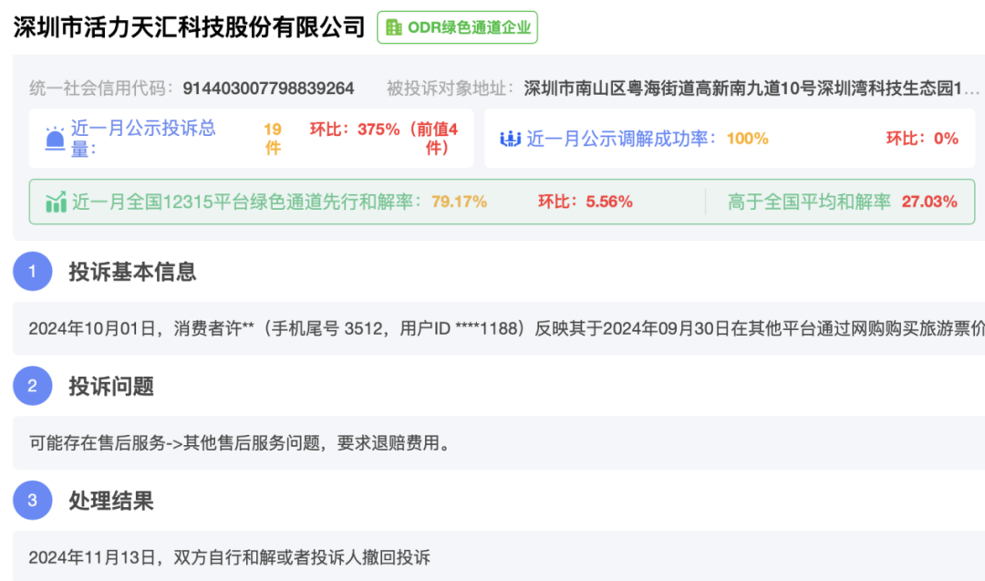 另据12315投诉公示平台信息,活力集团的核心公司深圳市活力天汇科技股份有限公司近一个月的投诉总量为19件,环比增长375%。