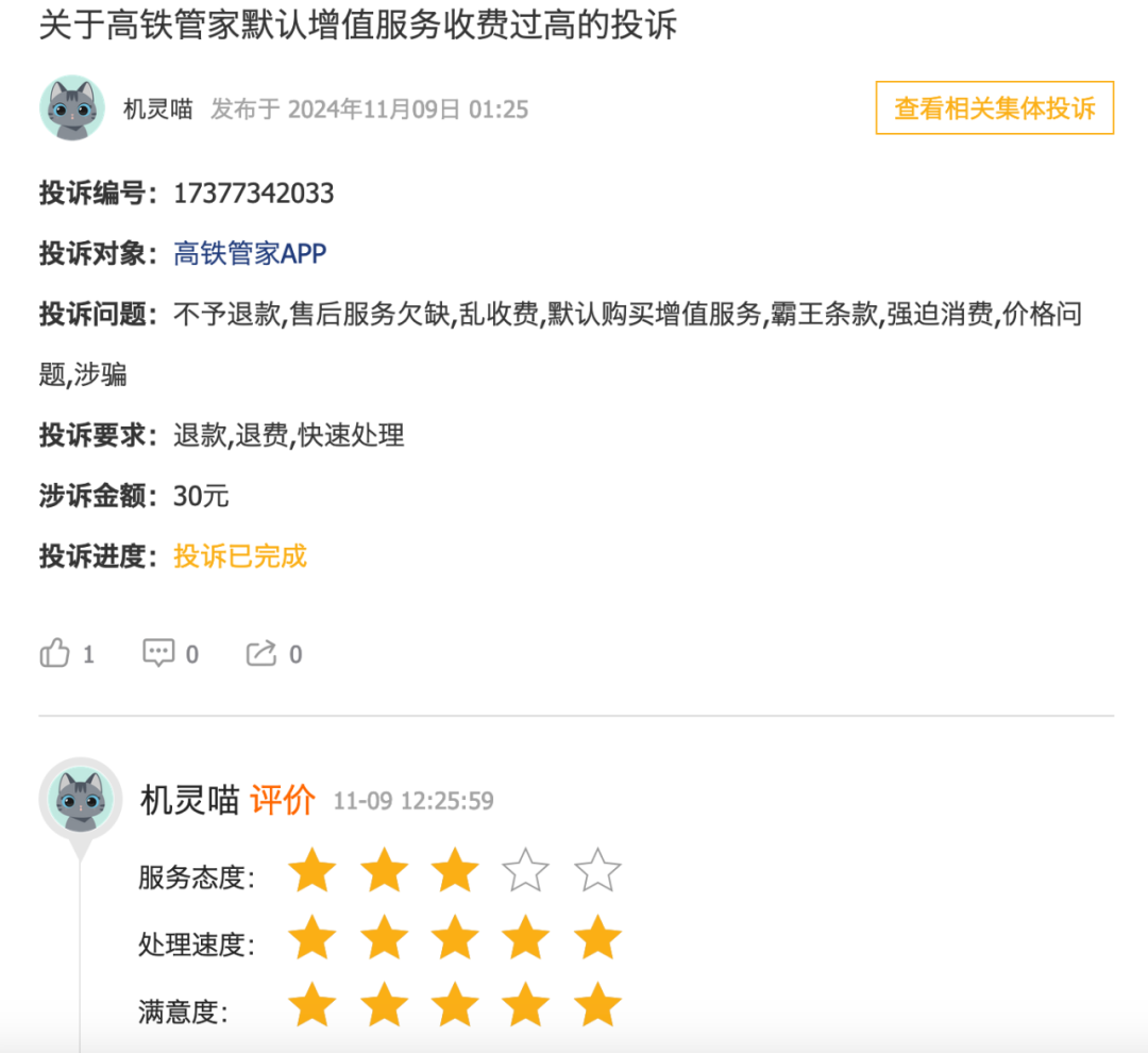 如一位消费者在今年11月9日投诉称,高铁管家默认增至服务收费过高,他表示自己在购买高铁票时发现平台默认勾选了一个增值服务费30元,因此他想要退款。