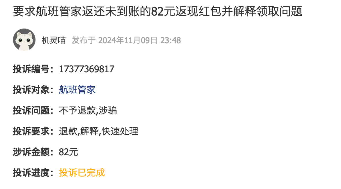 同样是11月9日,也有消费者投诉航班管家,要求他们返还未到账的82元返现红包并解释领取问题。