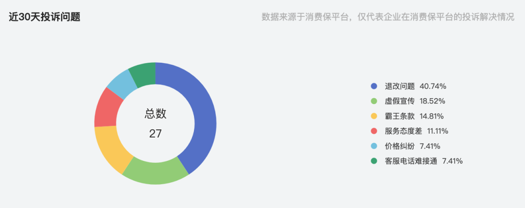 而高铁管家近30天内获得了27次投诉,其中退改问题的投诉占比为40.74%,虚假宣传的投诉占比为18.52%,霸王条款的投诉占比为14.81%。